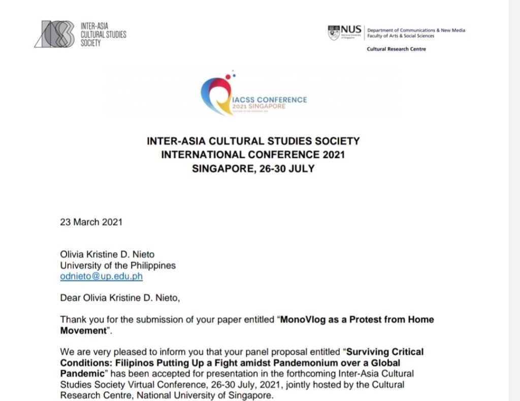 Umaaraw, umuulan sa pandemya pero tuloy ang usapang teatro. Buhay pa tayo! Got accepted in 2 conferences in Singapore:”MonoVlog as a Protest from Home Movement” for IACSS. Will be a presenting in the panel “Surviving Critical Conditions: Filipinos Putting Up a Fight amidst Pandemonium over a Global Pandemic” with my DSCTA colleagues and ka-fellow sa NUS-ARI Oscar Tantoco Serquiña (the mother goose of the team), Charles Erize Ladia (kabagang sa pagka-coordinator), Junesse Crisostomo (kabagang sa Social Drama).”Kapit: E-mergen(t/cy) Practical Experiments and Temporary Communities in Theatre” for SDEA. Inspired by Virgin Labfest’s Kapit which reflected the partnership between VLF and UP Diliman. Salamat sa inspiration, JKi Anicoche at sa buong VLF na kumupkop sa amin at nagturo pabalik sa university!Yung ang saya mo tapos naalala mo kailangan mo na isulat yung papel. ![]()