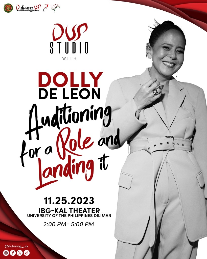 As an alumna of Dulaang UP, Dolly de Leon pays homage to her roots and theatre training by becoming the first mentor in DUP Studio. With distinguished theatre and film works backing up her reputation, more recently her blockbuster film A Very Good Girl with Kathryn Bernardo and her Cinemalaya 2023 Best Supporting Actress Award for Iti Mapupukaw, she serves as an example of the perfect coach for learning how to land a role in an audition.